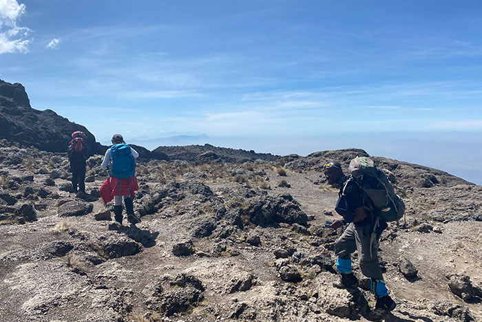 SummaryOn this day, your Kilimanjaro Lemosho Route adventure includes descending into a ravine and ascending the Great Barranco Wall, a non-technical but steep 900 ft cliff. From the top of the Barranco Wall, your path leads you across a series of hills and valleys until you descend sharply into Karanga Valley. The day ends at Karanga Camp, designed as a shorter day for acclimatization.